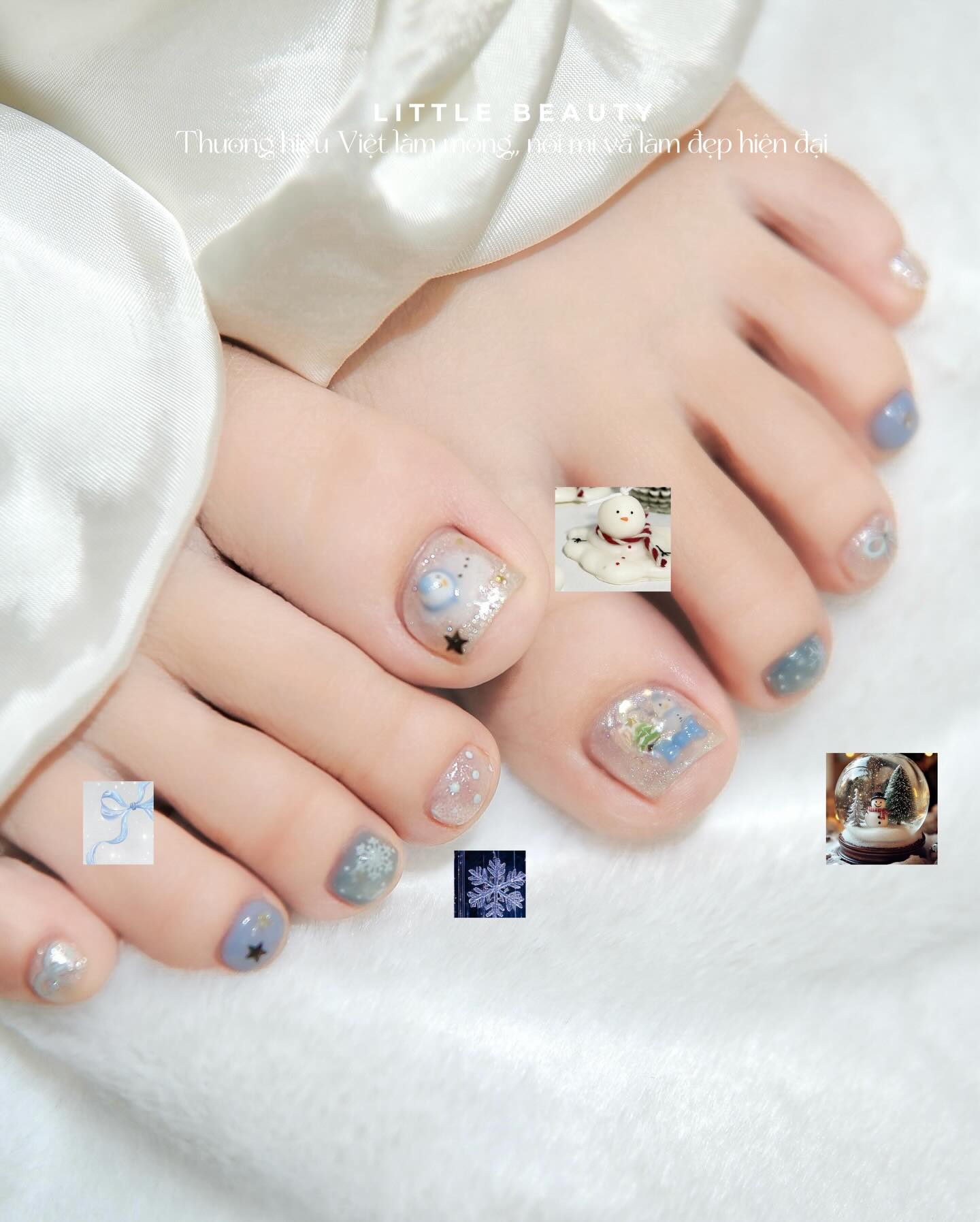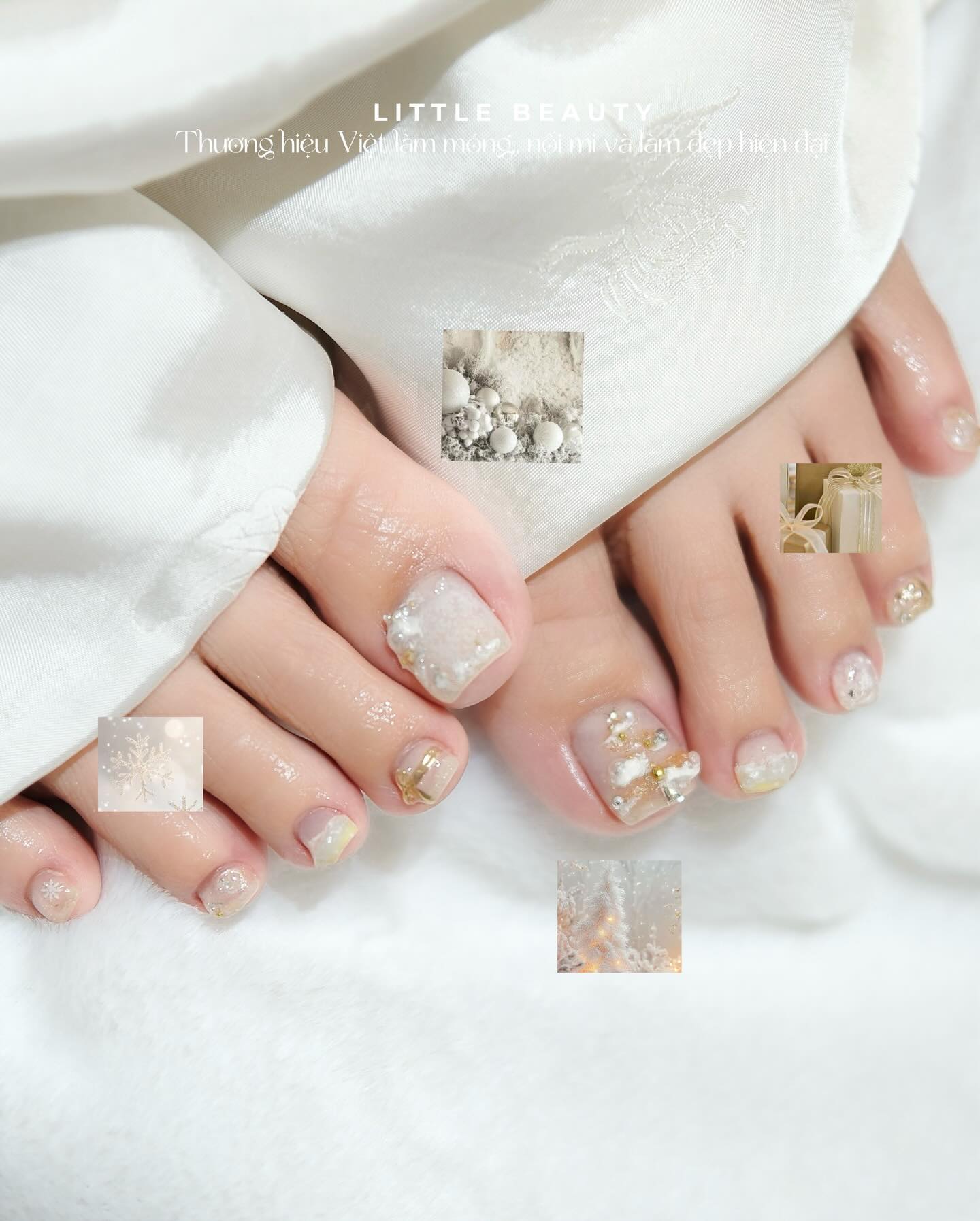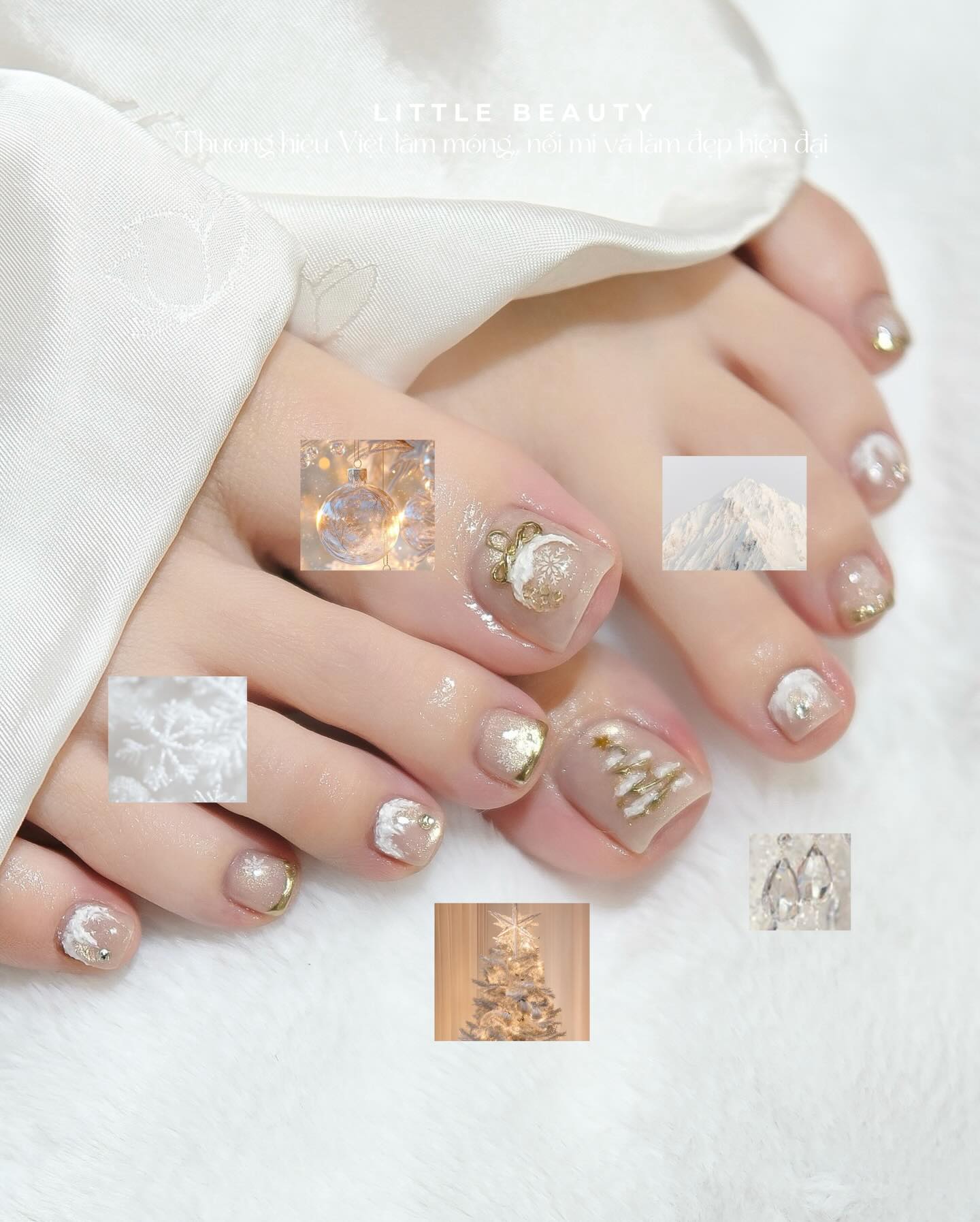 Mẫu đầu tiên trong bộ sưu tập mẫu nail chân Giáng Sinh của Little Beauty lấy cảm hứng từ hình ảnh quả châu thủy tinh, núi tuyết và cây thông được phủ ánh đèn vàng ấm. Nền móng được xử lý với tông nude sữa trong trẻo, pha chút ánh hồng nhẹ để tôn màu da, sau đó phủ loang trắng như lớp sương mờ trên mặt kính. Trên nền đó, kỹ thuật vẽ và dán charm 3D được sử dụng để tạo hình quả châu, dây nơ vàng, cùng họa tiết cây thông cách điệu.